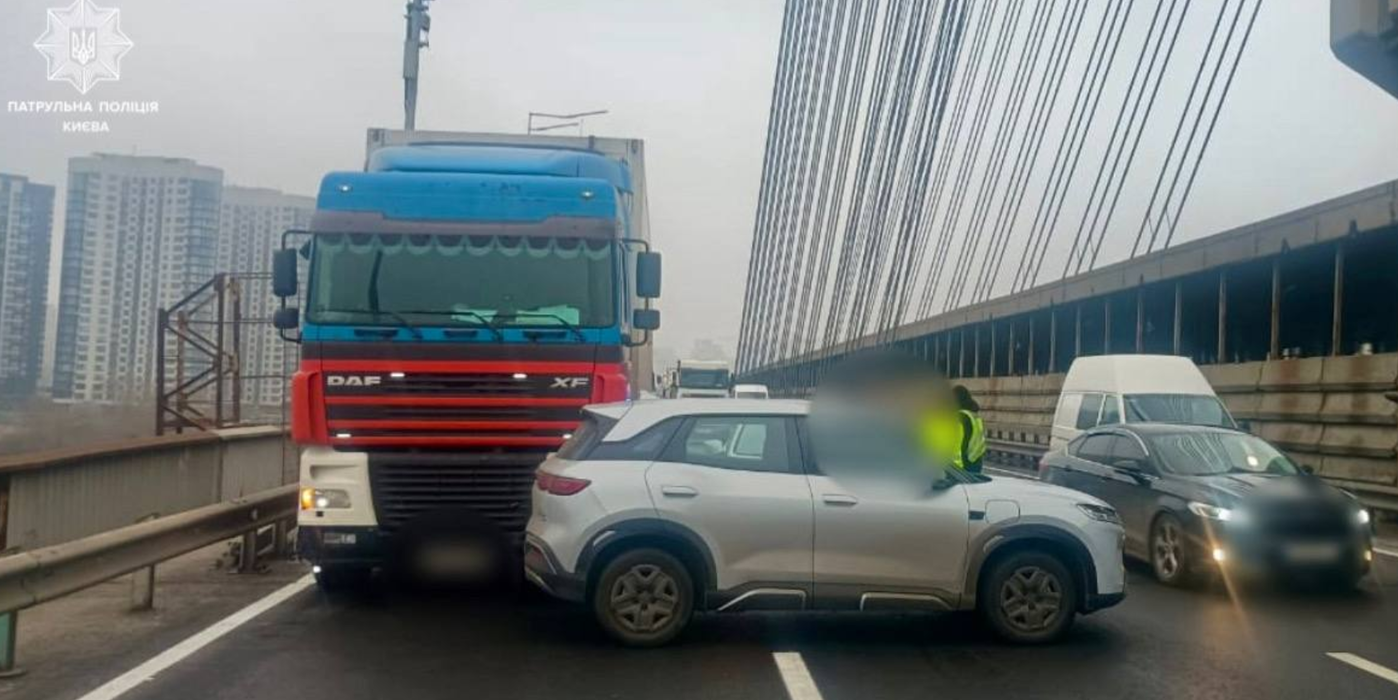 Сьогодні на мосту, який проходить між Голосіївським і Дарницьким районами, сталась аварія. За даними правоохоронців, водій автівки заблокував рух вантажівки. Як наслідок, зупинився інший транспорт.