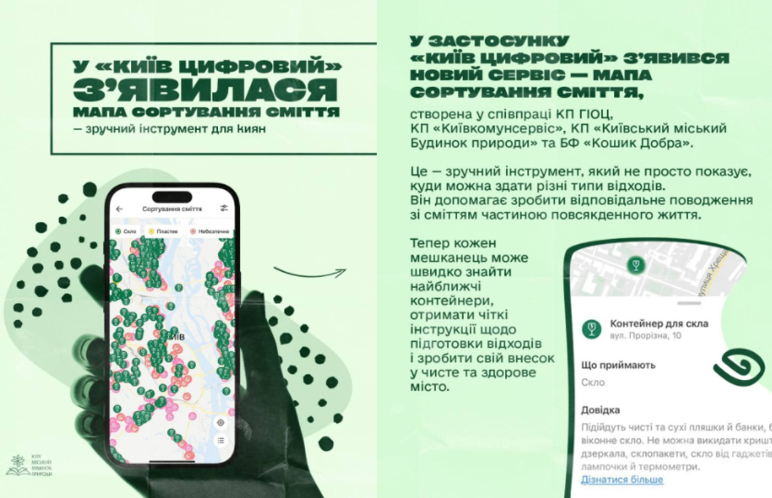 У КМДА зазначили, що мапа для сортування сміття у Київ Цифровому допомагає знайти контейнери для певного виду відходів і містить інструкції із сортування: