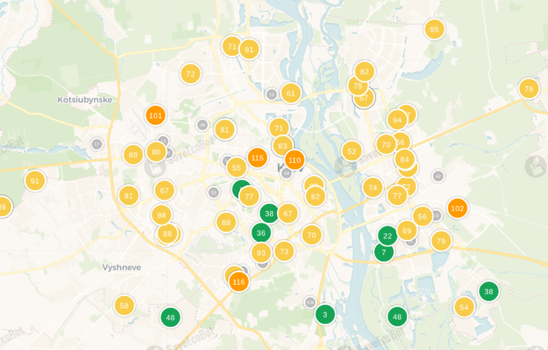 Наразі більшість із них перебувають на середньому рівні, відмічені жовтим кольором. Загальний рівень забруднення повітря – 70. Звертаємо увагу, що він може викликати погіршення самопочуття в людей з хронічними захворюваннями.