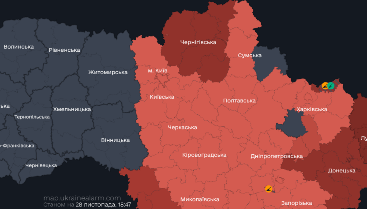 Увечері, 28 листопада, в Києві та області оголошена ракетна небезпека. Про це повідомляють Повітряні сили ЗС України.